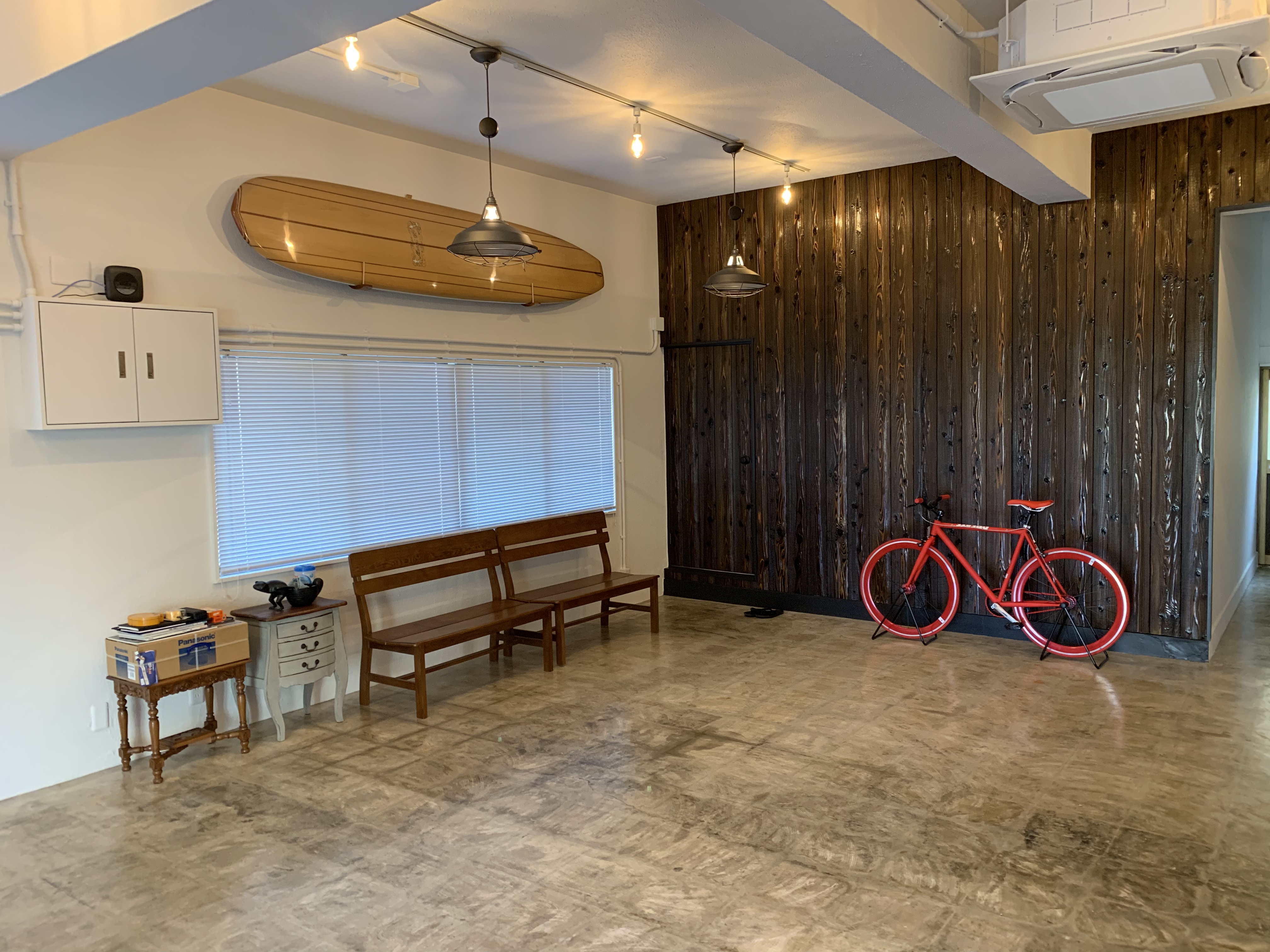 一面はダーク系の板張りにし