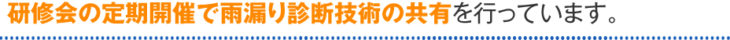 雨漏りの問題に取り組んで行くには、PLAN(計画)→DO(実行)→CHECK(検査)→ACT(改善)のサイクルに沿った品質管理体制が不可欠です。 そのためには教育機能と検査機能が組織内に必要です。 雨漏り119では定期的に研修会を開催しており、常に最新の技術や雨漏り事例を共有しております。 またSNSを通じて毎日全国から寄せられる雨漏り事例を全会員で情報共有し 検証しています。
